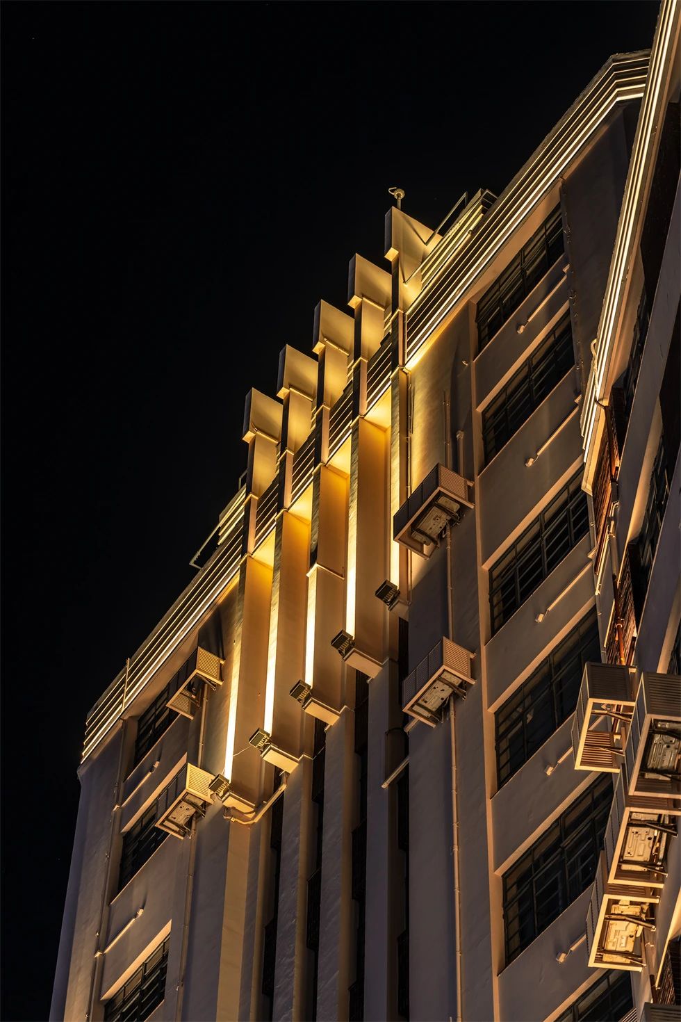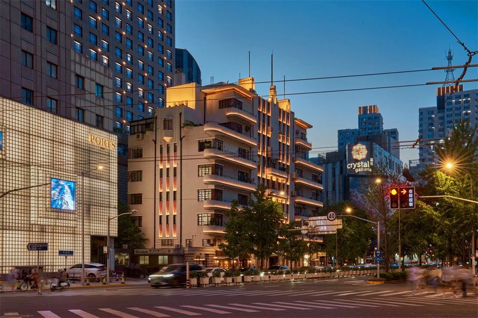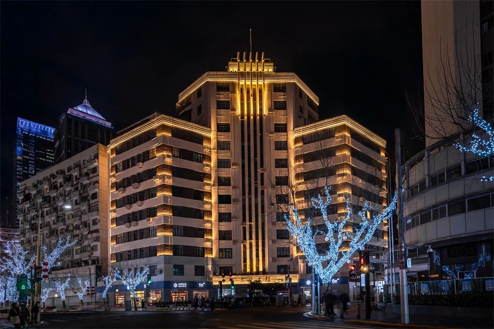 常德公寓為1936年竣工的裝飾藝術派風格建筑,夜景重點表現其東立面,層層向上的燈光富有節奏地烘托中部豎向線條,柔和升起的水平線性燈光優雅細膩地展現弧形伸展的陽臺,配合搖曳發光的裝飾燈,典雅低調,令人駐足。